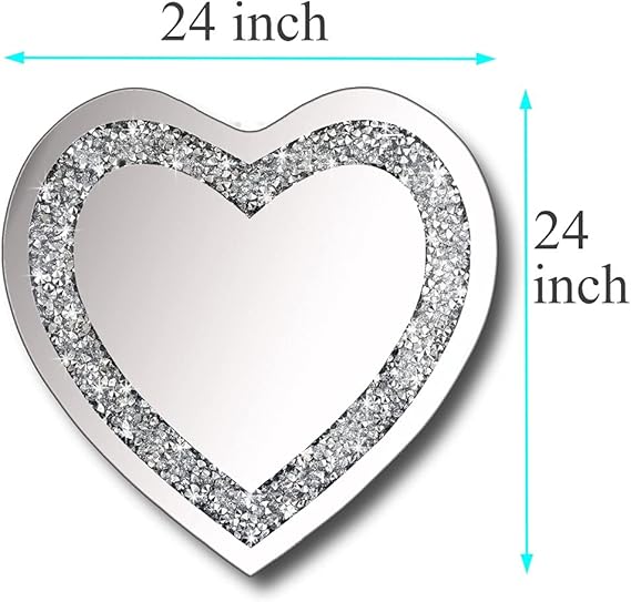 - Product size: 24x24 inch. Thickness 1”. Heart Shaped frameless design with Sparkle Twinkle Bling Crystal Crush Diamond. Wall decorative mirror. Classic design. 60x60cm